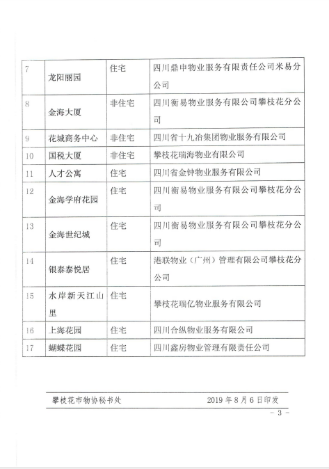 關(guān)于2019年攀枝花市物業(yè)服務(wù)品牌項目評定結(jié)果的通報